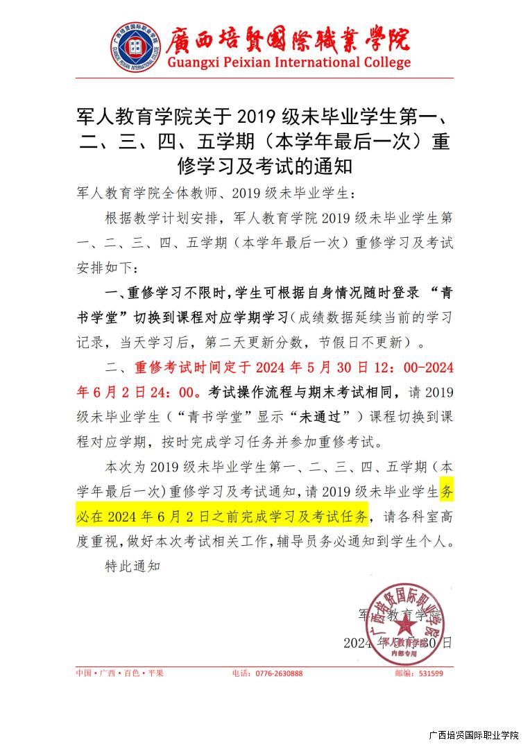 1. 军人教育学院关于 2019 级未毕业学生第一、 二🧑🏼‍🦱😧、三💎💪、四、五学期(本学年最后一次)重 修学习及考试的通知