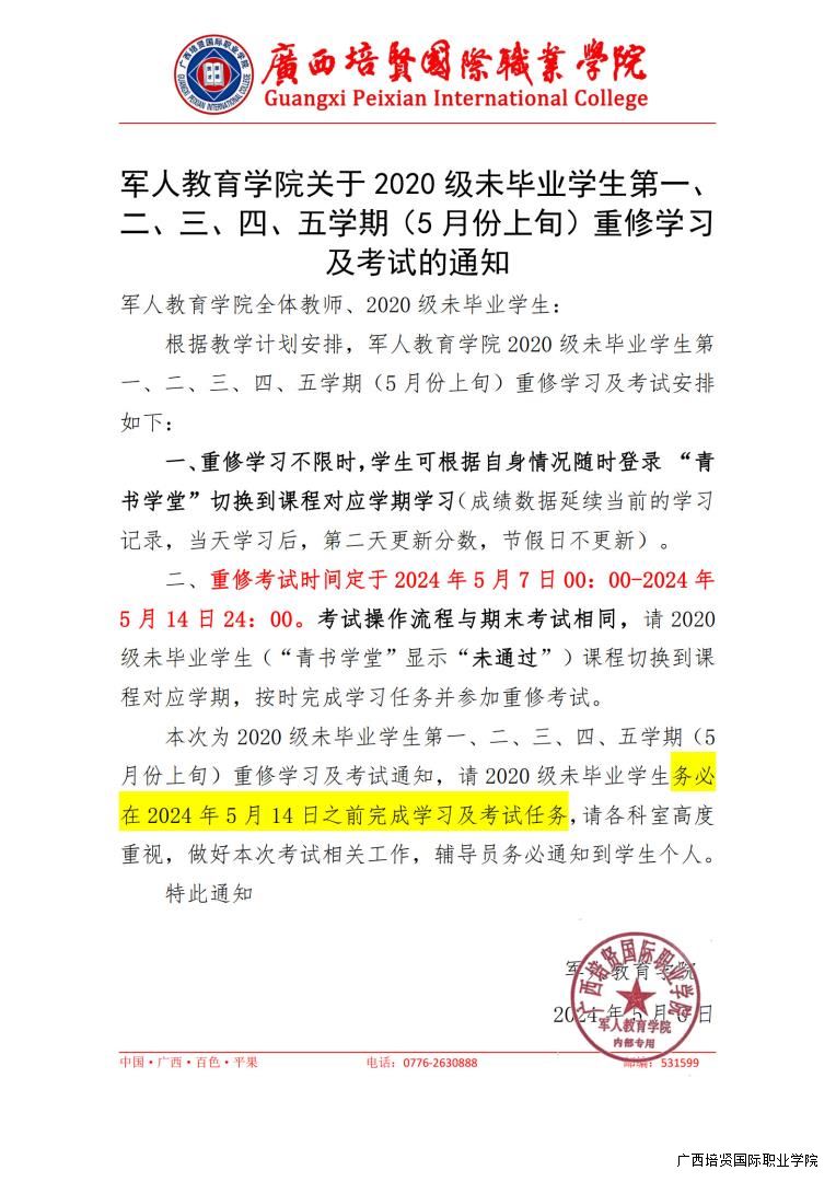 1. 军人教育学院关于2020级未毕业学生第一、二🧛🏼‍♀️、三🎅🏿♟、四、五学期(5月份上旬)重修学习及考试的通知