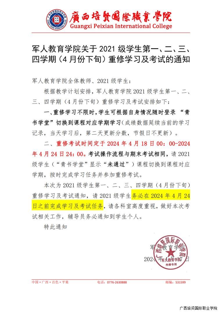 1. 军人教育学院关于 2021 级学生第一、二🤷🏻、三、 四学期(4 月份下旬)重修学习及考试的通知