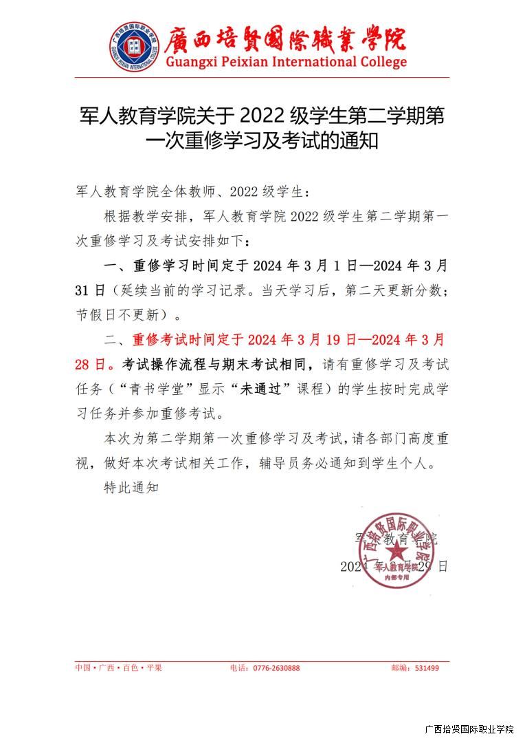 军人教育学院关于2022级学生第二学期第一次重修学习及考试的通知