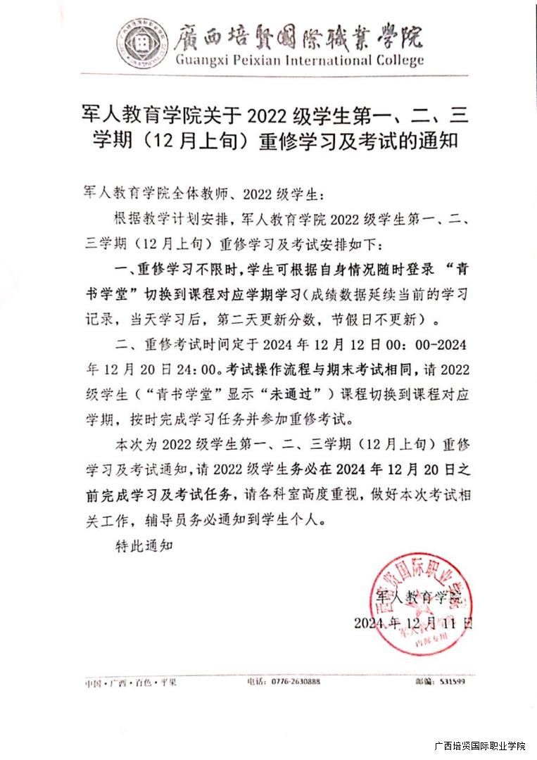 军人教育学院关于2022级学生第一、二👨🏻🏫、三学期(12月上旬)重修学习及考试的通知