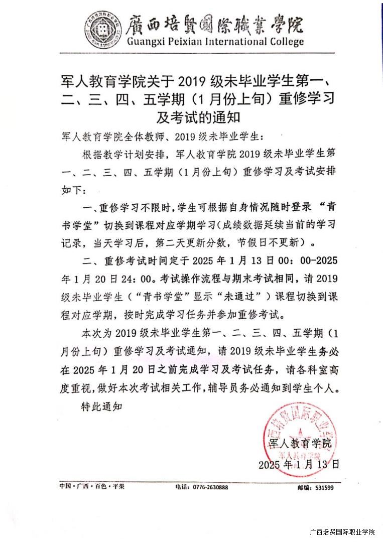 1. 军人教育学院关于2019级未毕业学生第一、二、三、四、五学期(1月份上旬)重修学习及考试的通知