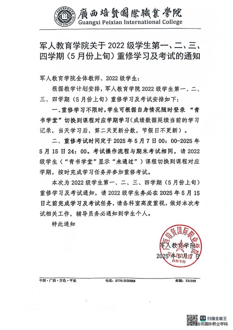 1. 军人教育学院关于2022级学生第一、二、三、四学期(5月份上旬)重修学习及考试的通知